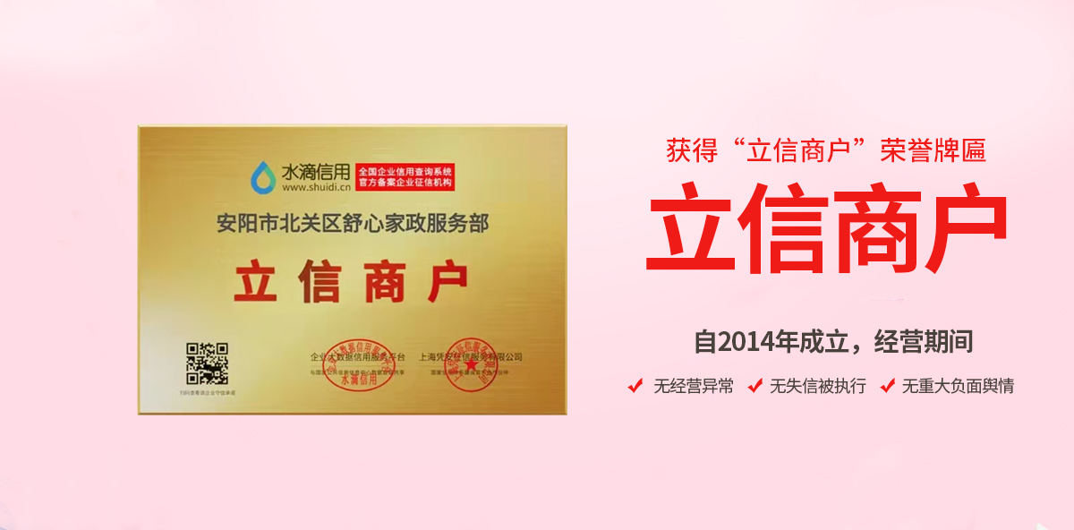 安陽市北關區舒心家政服務部立于2014年 是經工商管理部門注冊,具有母嬰護理服務機構 所有上崗人員均通過崗位技能培訓嚴格考核,持有身份證 健康證 母嬰護理師證并且在公安部門備案方可上崗。安陽市北關區舒心家政服務部針對產婦和新生兒的特殊護理要求制訂一整套的護理方法 在現代科學理念的指導下通過對產婦的飲<了解更多>